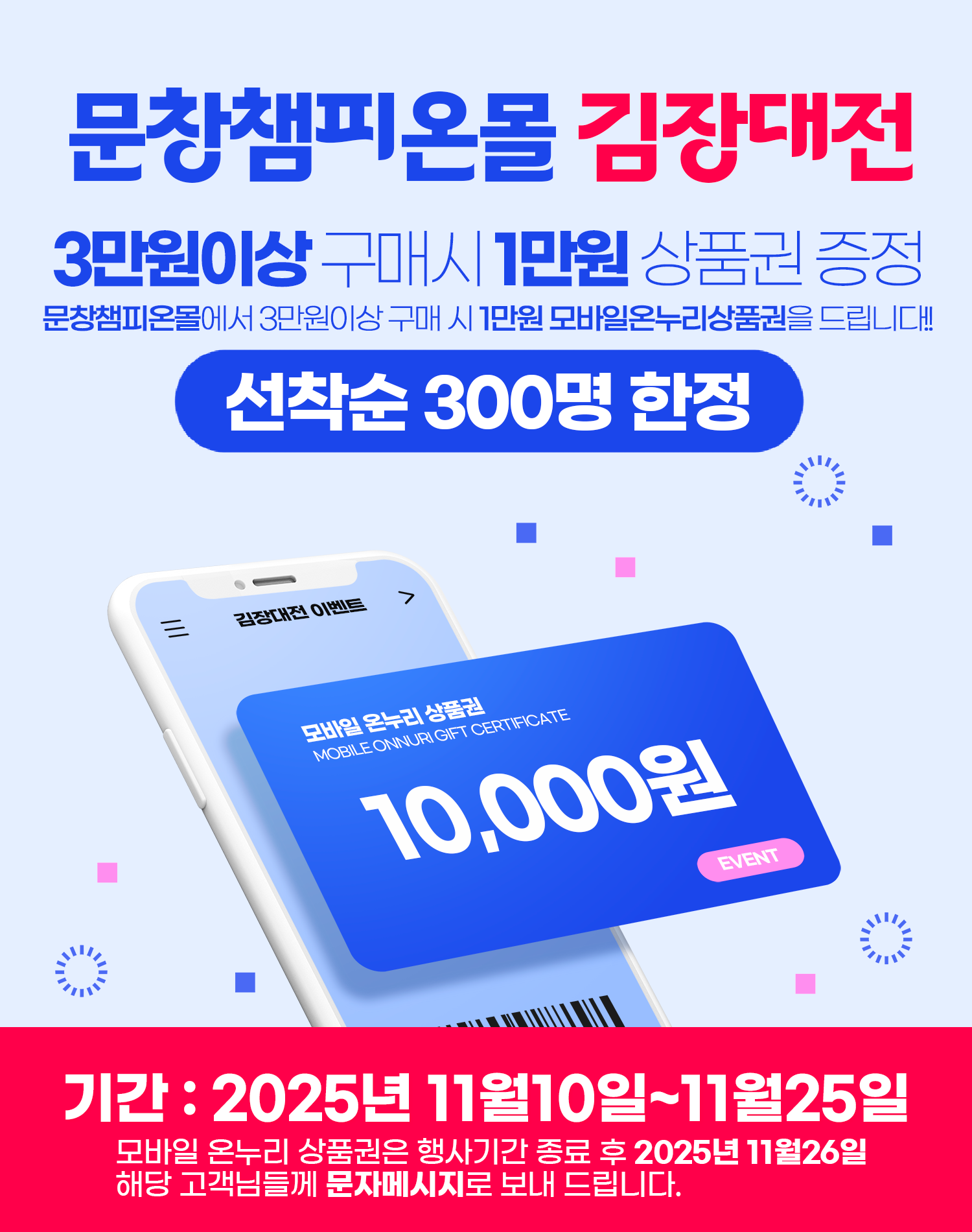 기간 : 2025년 11월10일~25일모바일 온누리상품권은 행사기간 종료 후 2025년 11월26일 해당 고객님께 문자메세지로 보내드립니다.
